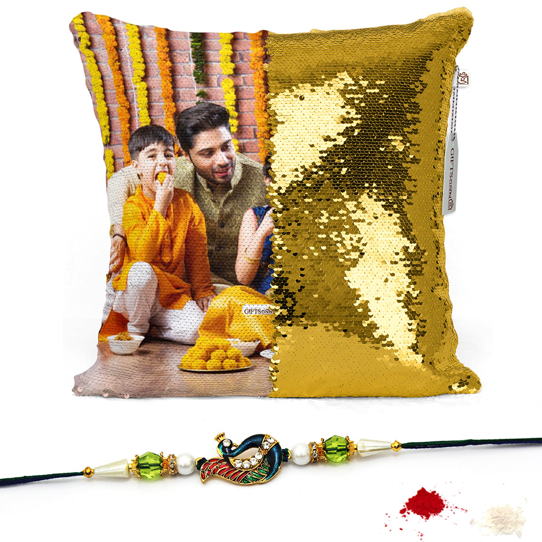 Personalized gold sequin magic pillow with rakhi - gifts for brother16x16 inch