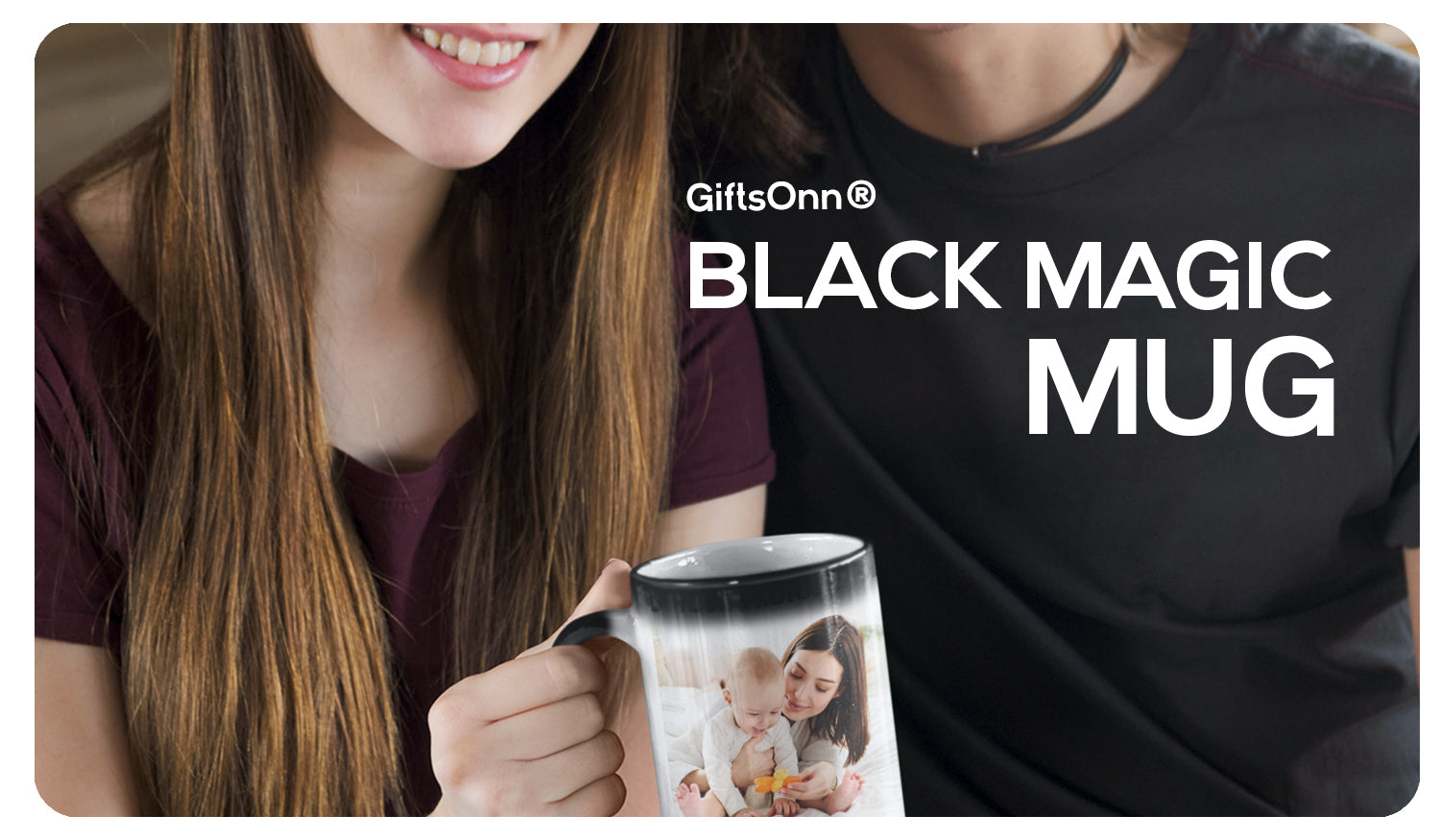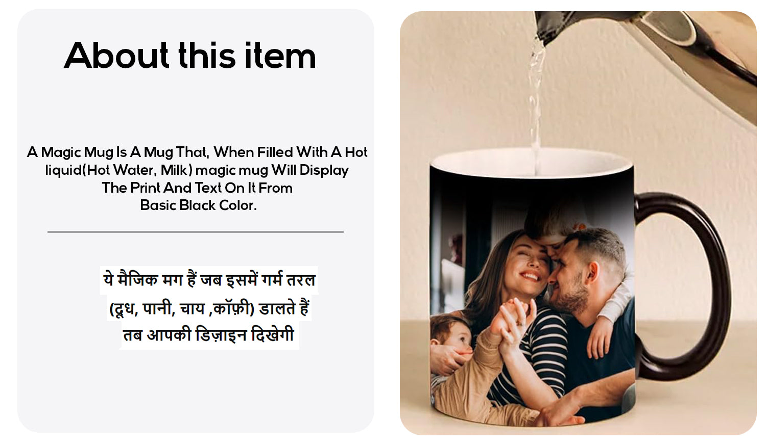 This is a magic mug which is black in color but shows the image when a hot liquid or beverage is poured in.
